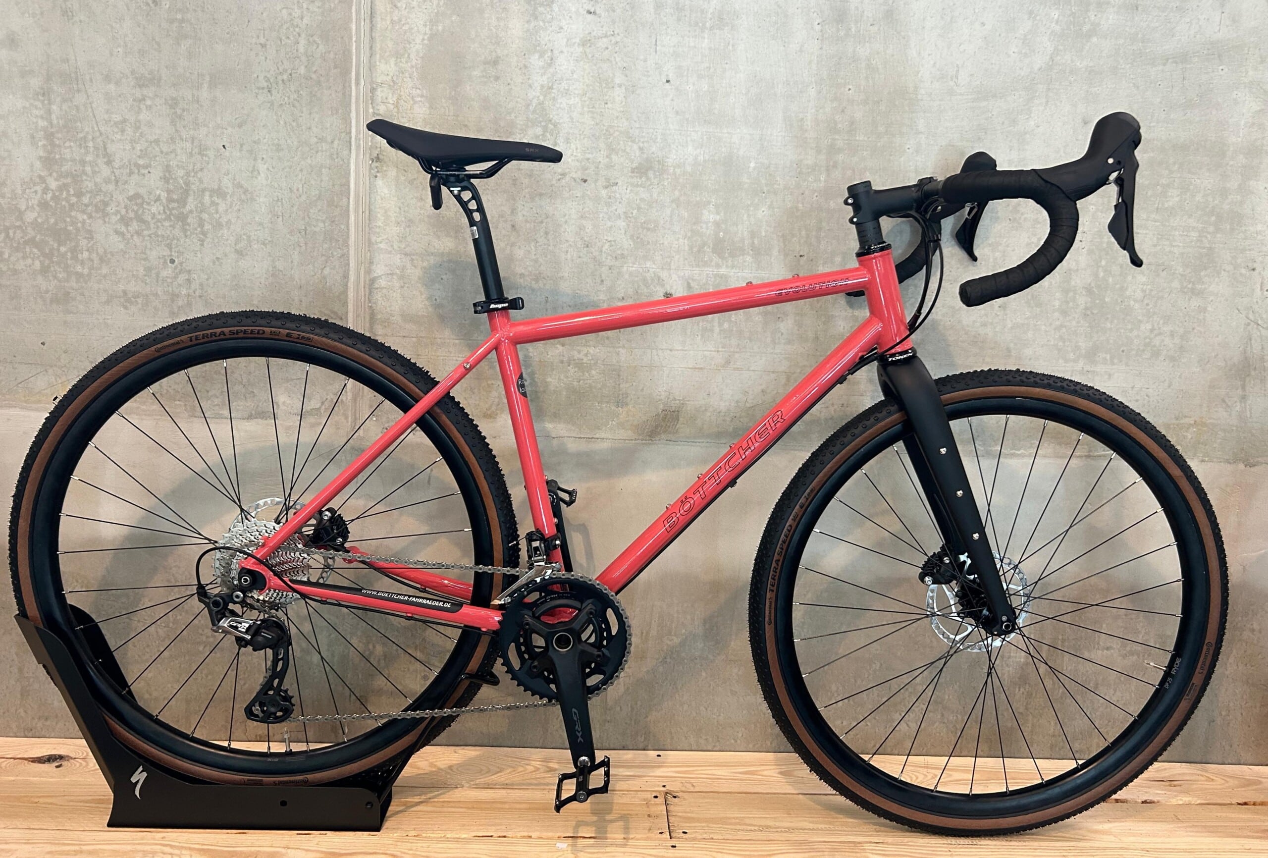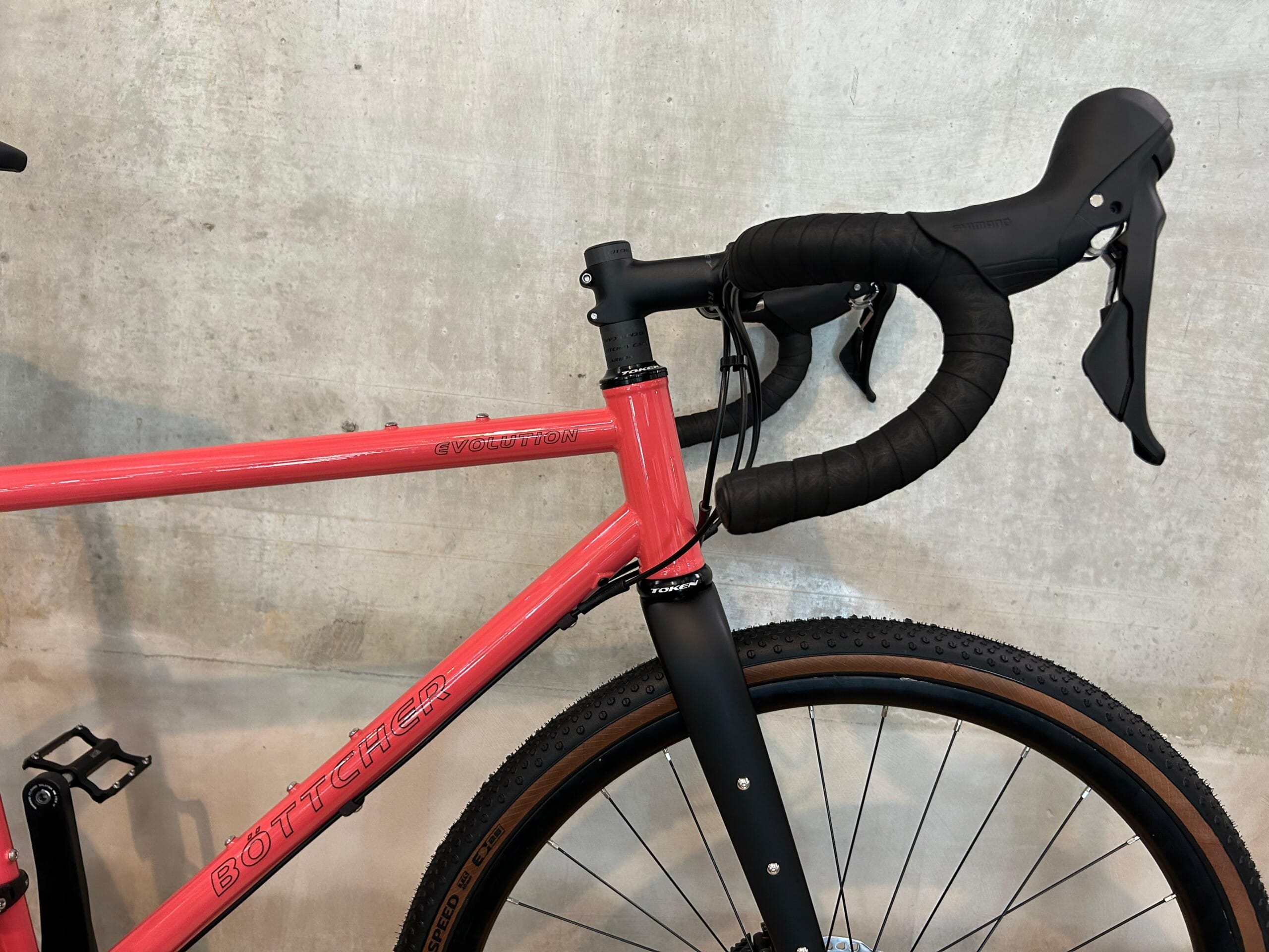 - Rahmen: Böttcher Evolution Gravel, Cr-Mo Rohrsatz, RH 48 (Hinweis: fällt durch das Slooping sehr groß aus. In dieser RH passt das Rad optimal für Personen zwischen 168-178cm)